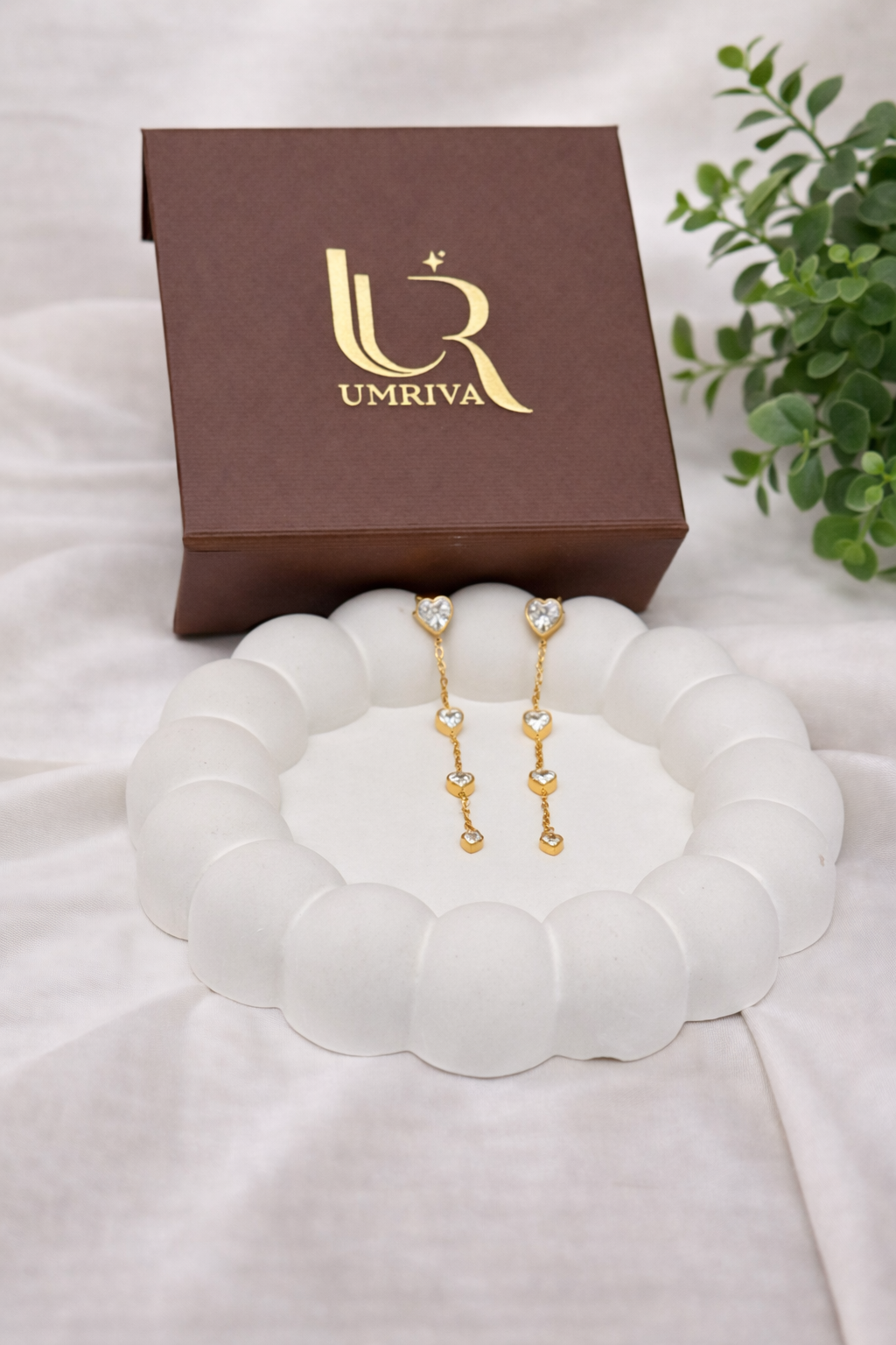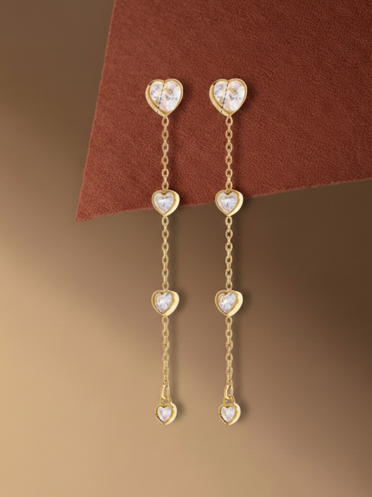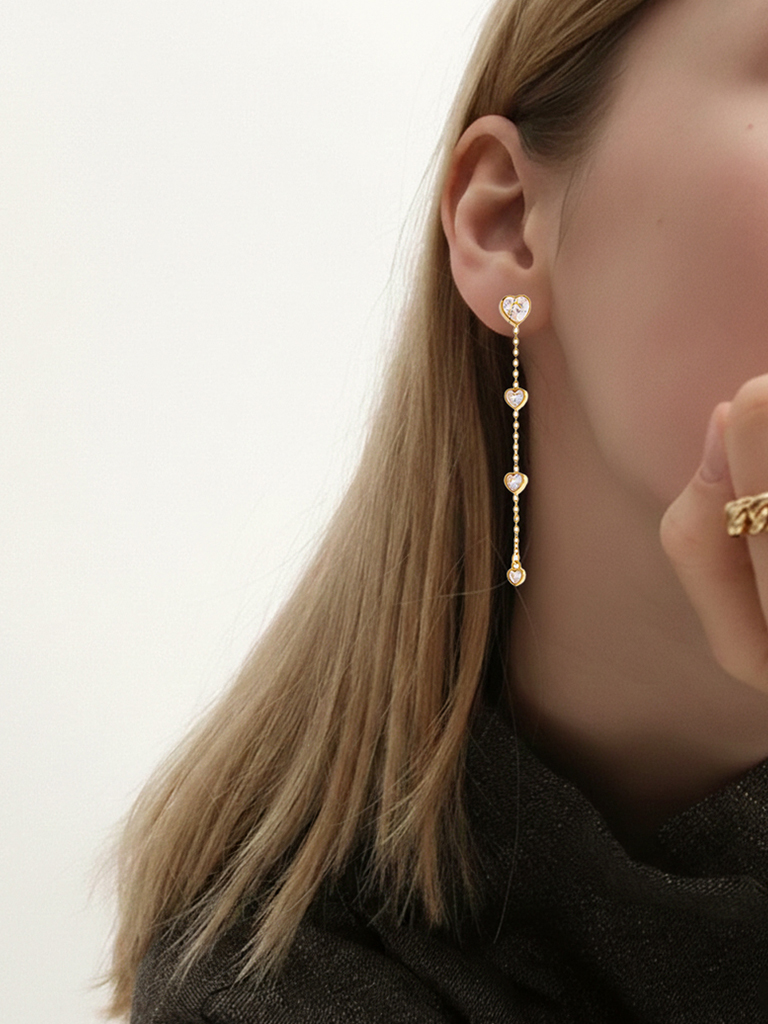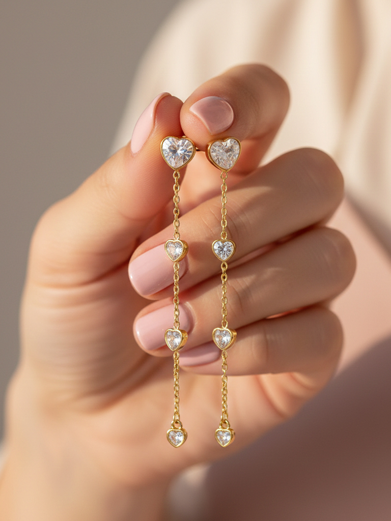 A refined drop earring designed with a heart-shaped stud and a fine chain extension detailed with delicate heart accents. The vertical silhouette creates gentle movement, while the slim proportions keep the design light and balanced, making it suitable for everyday wear as well as subtle evening styling.