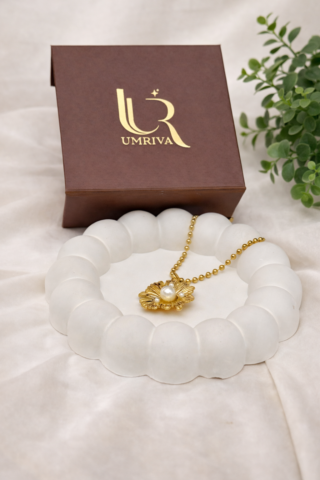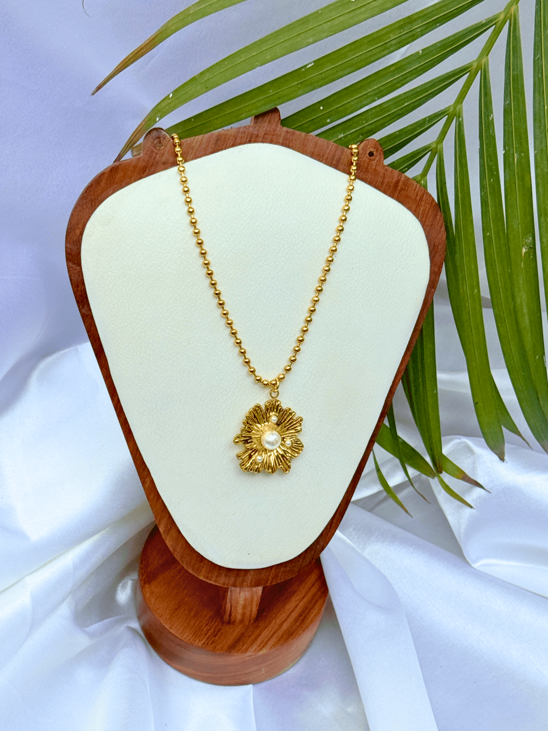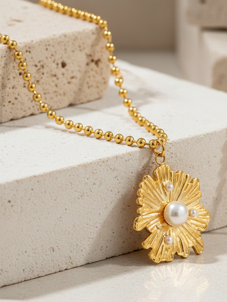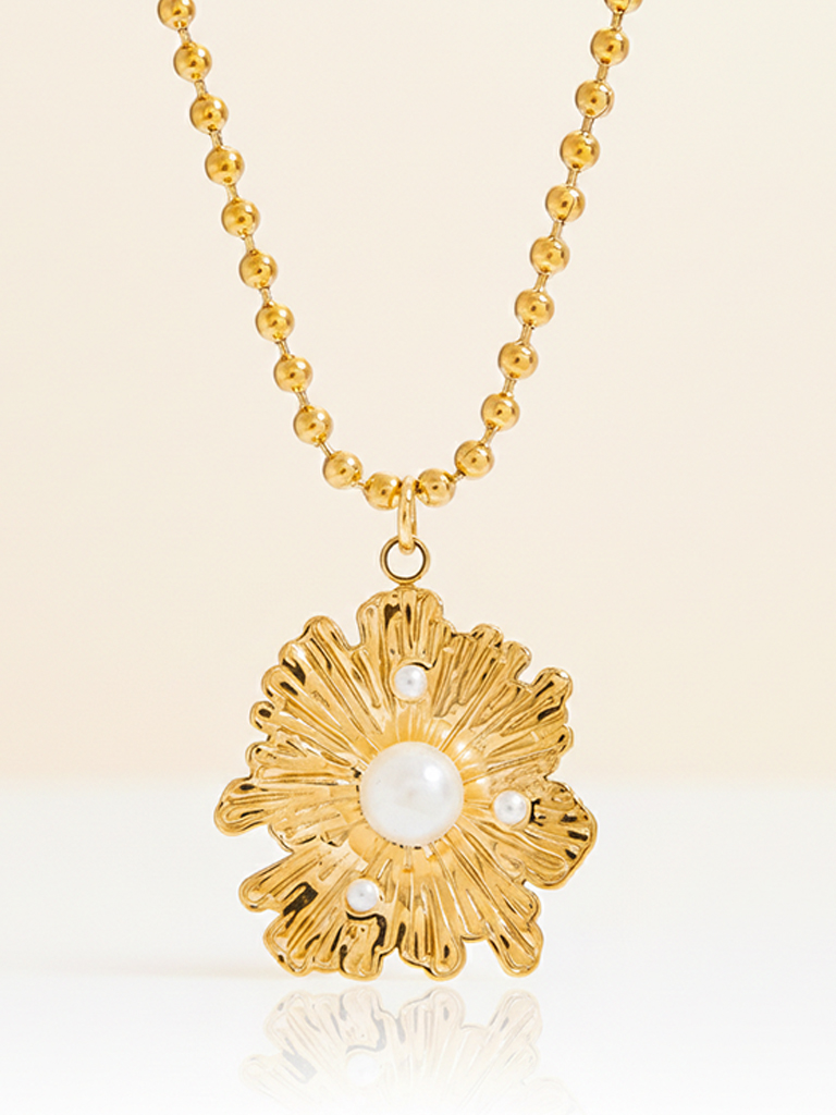 A sculpted floral medallion pendant designed with soft texture and gentle detailing that adds depth to the form. The statement silhouette is balanced by its smooth finish, making it a versatile piece that brings warmth and character to everyday outfits while remaining easy to style.